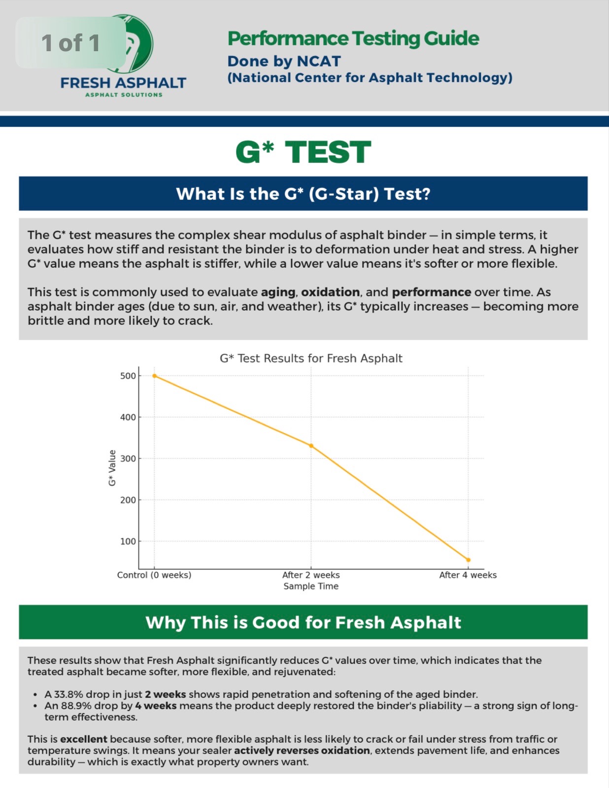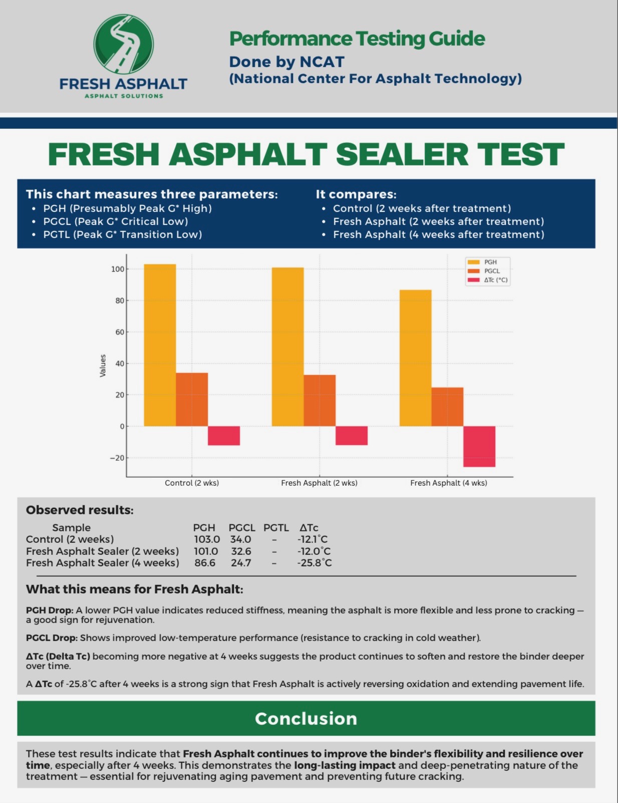 Independent lab testing shows that Fresh Asphalt Sealer dramatically improves asphalt flexibility, resilience, and longevity. Within just 2 weeks, it significantly reduces binder stiffness, making the surface less brittle and more resistant to cracking. After 4 weeks, the asphalt continues to soften and rejuvenate, reversing oxidation and restoring deep binder performance. The result? A long-lasting, penetrating treatment that helps pavements stay smoother, stronger, and protected, exactly what property owners and pavement managers want.